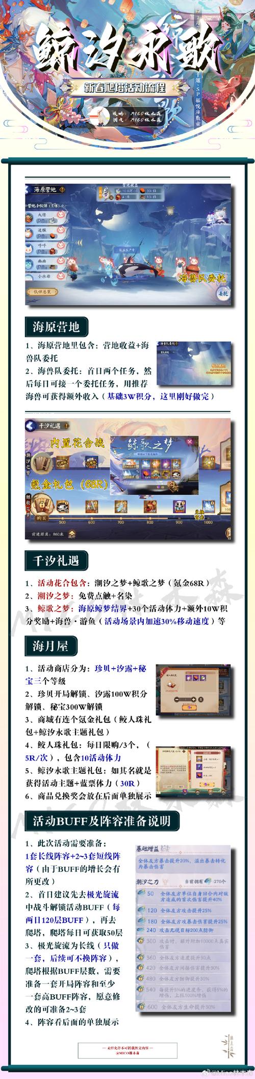 阴阳师鲸汐永歌活动详情如下:活动时间: 一阶段:2月7日维护后2月16日23:59,包含鲛人行歌、冰海异客、海原营地、海月屋、千汐礼遇等玩法。 二阶段:2月17日0:002月20日23:59,包含须臾永生、海月屋、千汐礼遇等玩法。