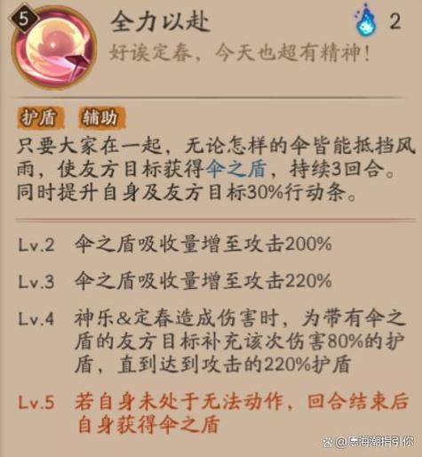 〖肆〗、阴阳师SSR神乐定春技能效果介绍 1技能 上吧,定春!对敌方造成攻击并分别为敌方附加吐槽和定春重击,效果持续2回合;吐槽:降低目标20%防御力和50%效果抵抗;定春重击:回合开始前造成间接伤害,比较多叠加3层。2技能 守护必达 带有伞之盾的友方选取敌方单体功目标攻击时会使用普攻进助战。