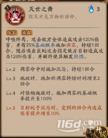 阴阳师伊邪那美技能介绍:普攻技能:湮灭 效果:召唤蛇群攻击敌方目标,造成攻击100%的伤害。二技能:神赐之吻(增益,印记)效果:造成伤害时无视100点防御。毁灭等级:自身每回合开始时毁灭等级上升,每上升1级防御降低100点,至多上升5级。唯一效果:我方场上至多存在1个此效果。