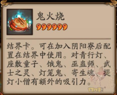 〖伍〗、阴阳师鬼火烧怎么获得?鬼火烧介绍 结界卡,对青行灯、座敷童子、饿鬼、巫蛊师、武士之灵、灯笼鬼、寄生魂、提灯小僧有额外的吸引力。随机奖励+1/h 备注:随机奖励指的是可以获得指定式神的碎片,结界卡分为四星和五星两种。
