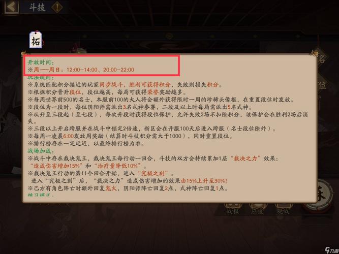 〖贰〗、“协同斗技”在协同斗技中,新增备战式神:每场战斗每位阴阳师大人可以选取总计6名不重复的式神出战,其中包含3个上阵式神和3个备战式神,备战式神可在战斗中接替上阵式神出战。协同斗技开放时间改为每天14:00至17:00。