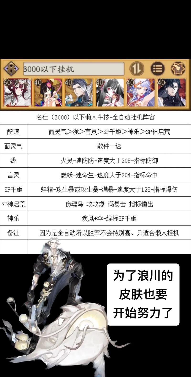 〖叁〗、阵容配置为童男+童男+茨木+拉条+打火机+惠比寿,茨木可以换成鸟,但考虑到星级限制,茨木成为备选。这个阵容以平民化为特点,采用复活流策略,童男的赖皮复活可给对手制造困扰,拉条则保证队伍不被频繁打断,同时镰鼬还有意想不到的DPS输出效果。