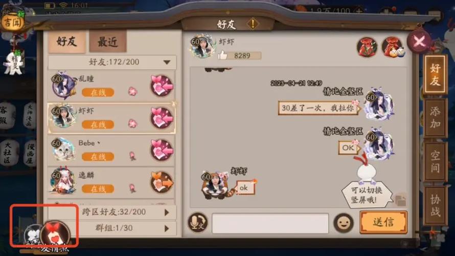 〖叁〗、在《阴阳师》中,玩家可以通过赠送或收取好友的友情点来快速积累。首先,启动游戏,进入庭院,打开卷轴,点击右下角的“好友”按钮。接着,打开好友列表,将左下角的筛选条件调整为“友情点”。这样,玩家就可以清晰地看到所有好友的友情点数量。