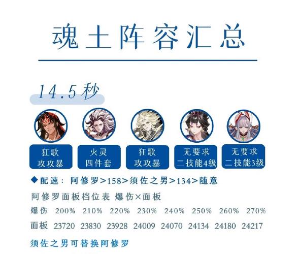 〖肆〗、阴阳师阿修罗魂土阵容17秒稳定配置如下:阵容搭配:阿修罗+鬼吞+帝释天+骁浪荒川之主+山风。这套阵容里,阿修罗是主力输出,山风负责补尾刀。阿修罗御魂:选取狂骨+鬼灵歌姬,属性攻攻暴,反堆爆伤和速度,速度控制在156至158之间。