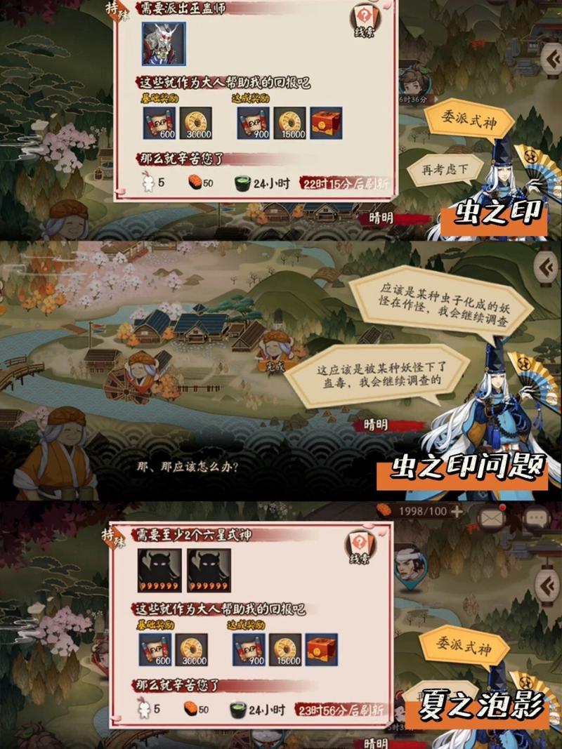 〖伍〗、任务星级说明:可接受的任务数量随着阴阳师的等级提升而提升,50级就可以开放四个任务。可以自动刷新,一次委派要12到15个小时不等。(式神不能同时在多个委派任务里)星级越高奖励越多,体力的消耗也是30-50不等。