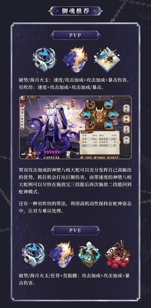 〖叁〗、《阴阳师》SP神堕八岐大蛇的最强最佳御魂搭配方案如下:PVP搭配方案 2号位:攻击加成 4号位:攻击加成 6号位:暴击伤害 点评:此搭配方案主要强化了神堕八岐大蛇的输出能力,使其能够在PVP战斗中快速且强力地击败对手。