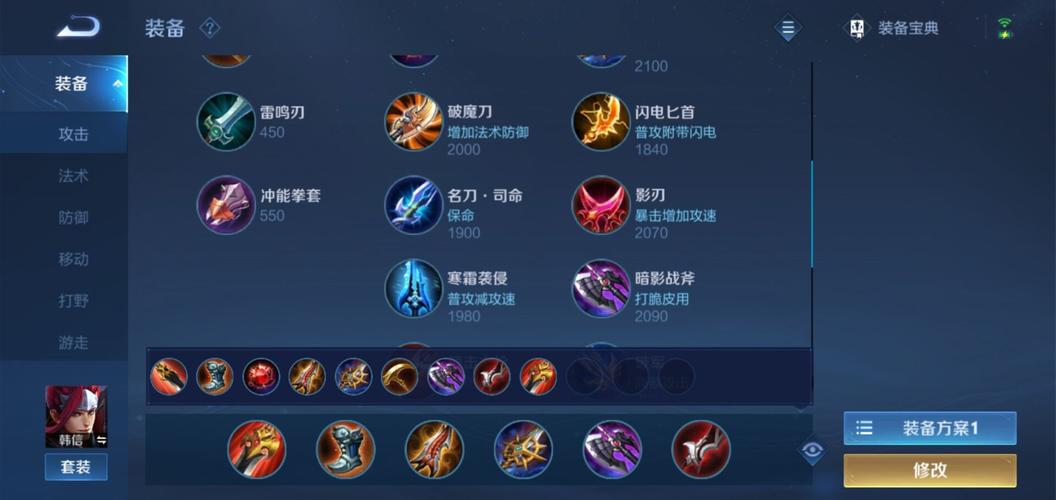 〖贰〗、出门装 一般而言韩信都是作为打野英雄来使用的,所以打野韩信出门装是狩猎宽刃,随后刷取了一定的经济之后将追击刀锋做好。 中期装备 在中期韩信需要提升自己的伤害输出能力了,所以建议大家做出破甲弓、影忍之足、泣血之刃这几件装备。