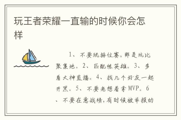 〖伍〗、在王者荣耀中一直输,可以尝试以下几个方法来改善:调整心态:心态不佳时暂停游戏:当心态不好时,建议暂时停止游戏,因为不良的心态会影响游戏表现,增加输掉比赛的概率。控制游戏时间:连败后暂停游戏:如果出现连败,建议立即停止游戏,避免情绪进一步恶化,影响后续比赛。