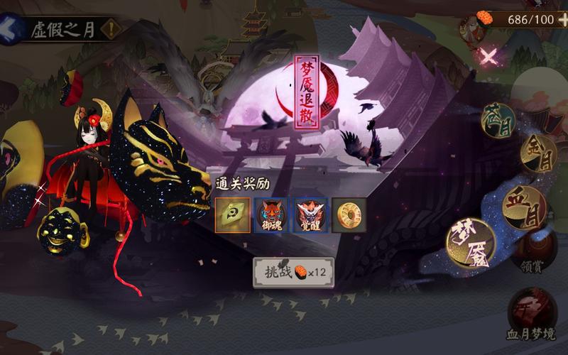 〖肆〗、点击地图上的式神头像或者底部的血月梦境快捷入口打开玩法。血月梦境分为苍月、金月、血月、梦魇四个难度。苍月、金月、血月为通常关卡,难度依次递增,阴阳师大人通过关卡也会随难度获得更好的奖励。梦魇难度为挑战关卡,阴阳师大人只需要通过一次即可获得关卡奖励。通过后不可重复挑战。