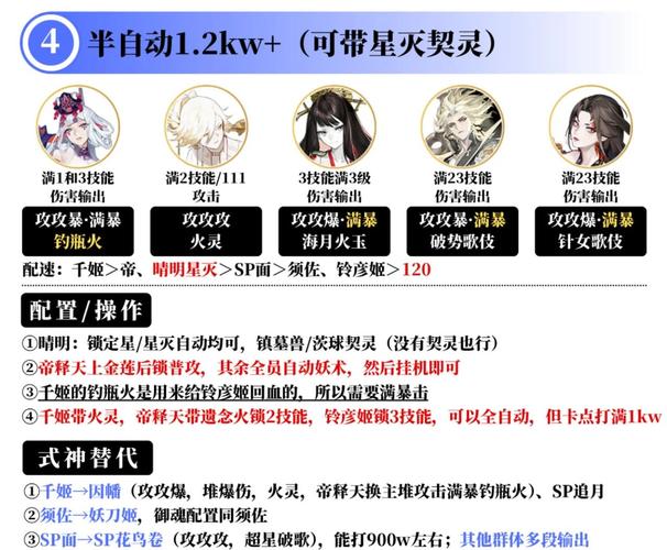 〖叁〗、阵容推荐 10层6回合阵容一:技能搭配:朝生+送月+眠灯+攀雪配速:缘结神铁鼠晴明阿修罗蟹姬茨林 123 (小怪)打法:此阵容适合技能满级后使用。根据自身的暴击加成来调整输出面板,确保稳定输出。因为有速度加成,辅助角色也可以适当反堆速度。