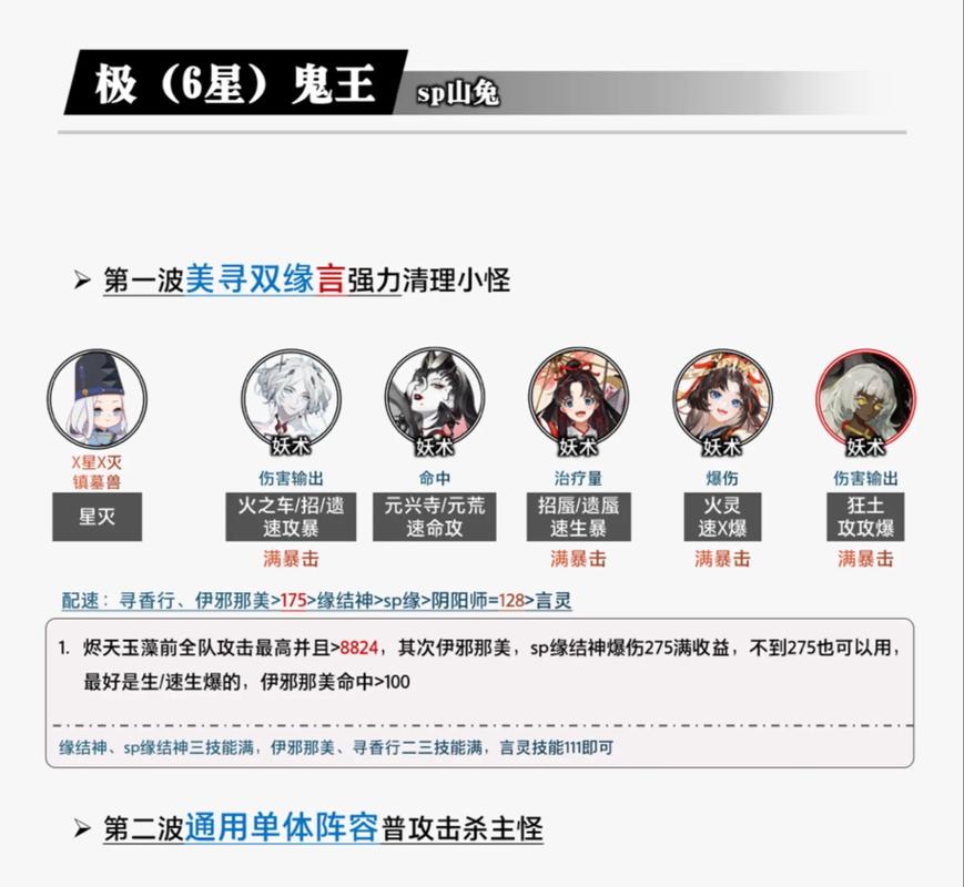 超鬼王夜神刀阵容推荐 通用思路:食灵喂饭空面,拔小怪(飞缘魔),之后处理boss,记得空面切标。御魂:①配速:食面帝寻SP辉夜须佐。②系统寻香行:锁二技能。③食:遗念火速攻攻(妖术)。④面:海月速攻爆伤满暴击(清小怪适当切标)。⑤帝:遗念火攻攻攻(开莲花后普攻)。