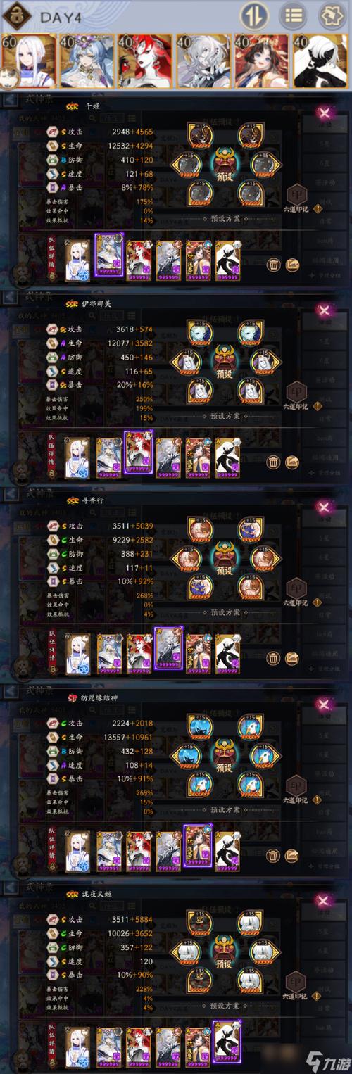 〖壹〗、Day4:麓铭大岳丸+帝释天+蝎女+缘结神+座敷童子,帝释天、蝎女速度需大于230,麓铭大岳丸狂骨+土蜘蛛,其他根据需求调整。Day5:通用阵容,书翁替换为狂骨+土蜘蛛的阿修罗,千姬换为共潜攻攻攻,进行1轮强追。若换针歌攻攻攻阿修罗,可尝试极限普追一波。