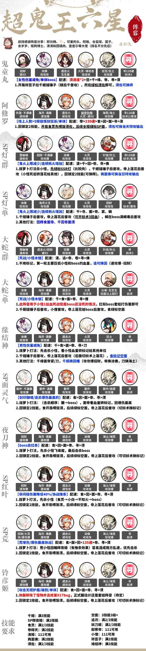 〖叁〗、速度排序为SP面灵气、晴明、食灵、书翁、千姬、帝释天。第二套阵容则是阴阳师晴明(需携带盾牌,首回合开启护盾)、千姬(火灵四件套)、SP空相面灵气(海月火玉四件套)、食灵(共潜四件套)、蝎女(散件)、风狸(兵主部四件套)。此配置同样适用于挑战超鬼王,且具有较高的胜率。