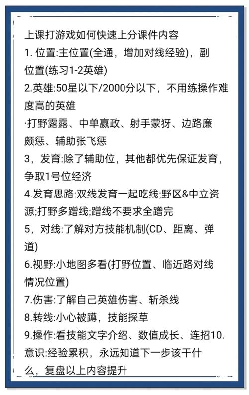 要提高王者荣耀的胜率并实现快速上分,可以从以下几个方面着手:深入了解游戏 熟悉规则:全面了解王者荣耀的游戏规则,包括推塔、击杀暴君和主宰等关键目标,以及地图布局和线路资源的重要性。掌握英雄:深入了解各个英雄的技能、属性和定位,根据团队需求和个人喜好选取合适的英雄,并关注英雄间的克制关系,合理搭配阵容。