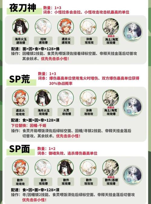 清姬:御魂选取雪幽魂+夜行火/招财猫/荒骷髅,注重命中与速度。寻香行:御魂选取招财/遗念火,属性为攻攻爆伤,确保高输出,满暴击。SP缘结神:御魂选取火灵,最大化爆伤。歌留多:御魂选取恶楼或兵主部,无需满暴击。