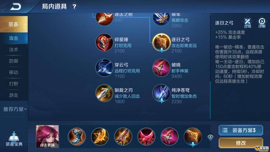 出装顺序解析 攻速鞋:首先选取攻速鞋,提高伽罗的移动速度和基础攻击速度,有助于她更好地进行风筝和输出。破军:下面选取破军,大幅提升伽罗的物理攻击力,增强她的单体伤害能力。破败王者之刃:随后选取破败王者之刃,增加攻击速度和物理攻击力,同时提供生命偷取效果,增强伽罗的持续作战能力。