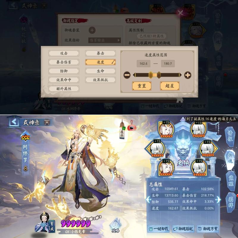 〖肆〗、阴阳师阿修罗魂土最低配置搭配如下。阿修罗面板属性及技能解读 属性面板(SS攻击4127,S速度119,S暴击10%)阿修罗拥有SS级攻击力,比同为SS的八岐大蛇高出53点,速度与面灵气相同。其属性在同级别式神中相对较高。一技能:红莲诛灭 击杀目标会附加“诛灭”印记,使其攻击永久下降50%。