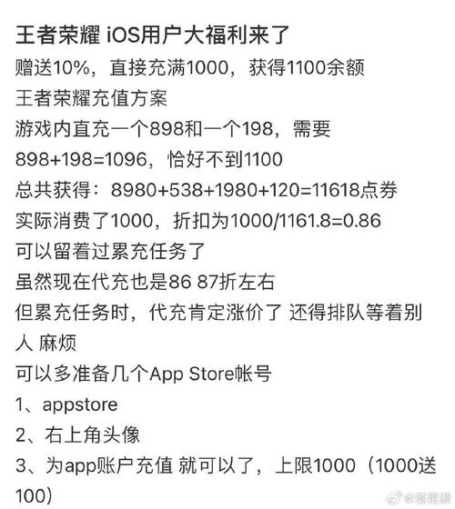 〖壹〗、苹果王者荣耀充值方式主要有两种:应用内购买:打开王者荣耀,进入游戏界面。点击屏幕右上角的“我”按钮,进入个人中心。在个人中心页面,找到并点击“充值”选项。选取合适的充值金额,点击“确认支付”。根据提示,通过Apple ID绑定的支付方式完成支付。支付宝充值:同样在游戏界面内,点击屏幕右上角的“我”按钮,进入个人中心。