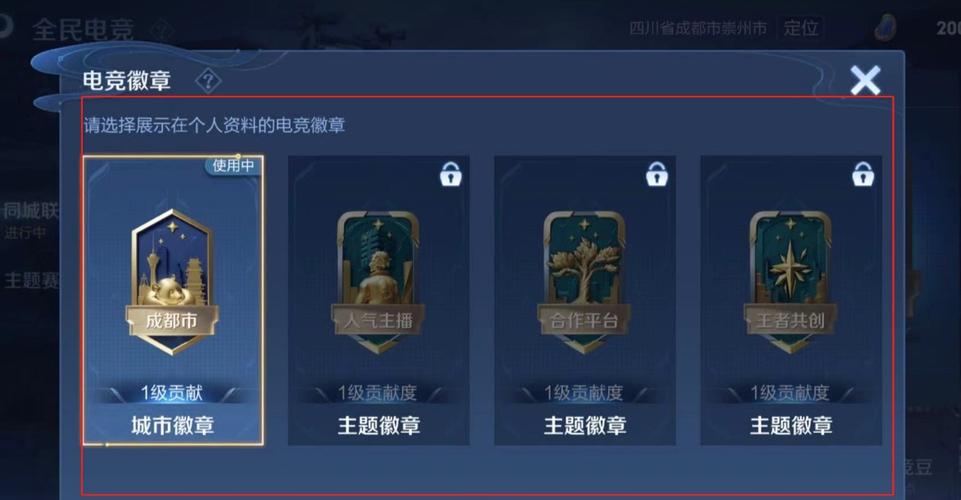 〖贰〗、王者荣耀城市徽章4级的升级办法主要是通过参与全民电竞活动。以下是具体的升级攻略:参与全民电竞活动 积极参赛:玩家需要不断参加全民电竞活动,这是提升城市徽章等级的主要途径。每次参与都会对徽章的升级有所贡献。