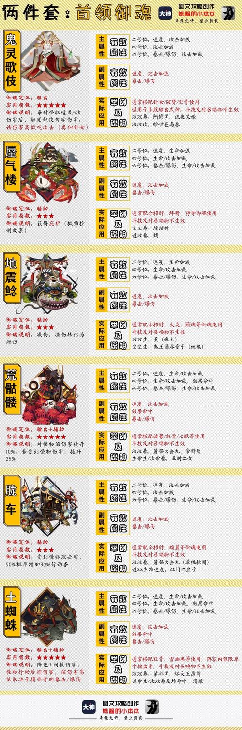 主属性固定,副属性随机:和普通御魂一样,首领御魂各位置的主属性都是固定的,而副属性则是随机出现的。基础属性加成:首领御魂只有2件套效果,提供基础属性(攻击、生命、防御)加成。6星首领御魂的基础属性加成为+6%。唯一被动效果:首领御魂的2件套效果为唯一被动,且仅在与怪物对战中生效。