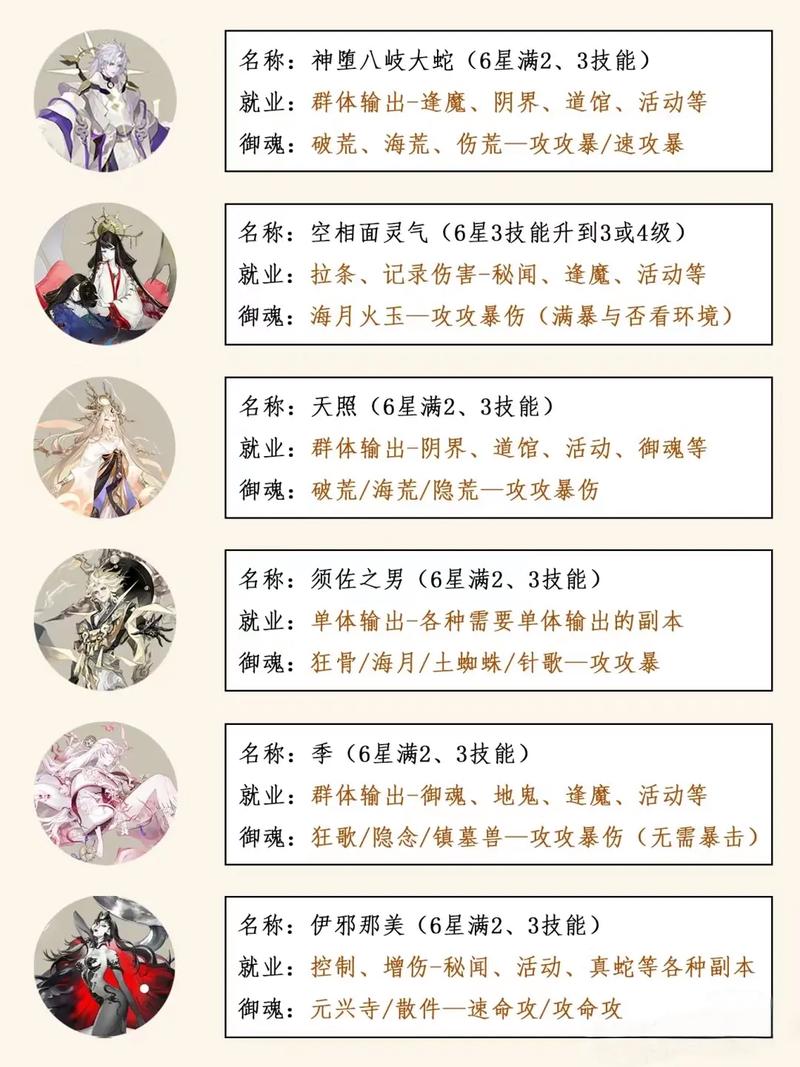 属性选取攻击、暴击、暴伤三件套。对于辅助式神:鬼火发动机:如座敷童子,招财猫或火灵四件套是标配,属性堆生命和防御保证存活。核心辅助:如椒图,推荐地藏像或招财猫,二号位必须带速度确保先手连线。奶妈:如惠比寿,御魂非常灵活,地藏像或纯生命散件都能用,但要注意二号位速度让旗子尽早落地。