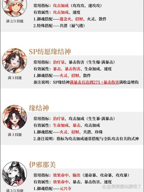清姬:御魂选取雪幽魂+夜行火/招财猫/荒骷髅,注重命中与速度。寻香行:御魂选取招财/遗念火,属性为攻攻爆伤,确保高输出,满暴击。SP缘结神:御魂选取火灵,最大化爆伤。歌留多:御魂选取恶楼或兵主部,无需满暴击。