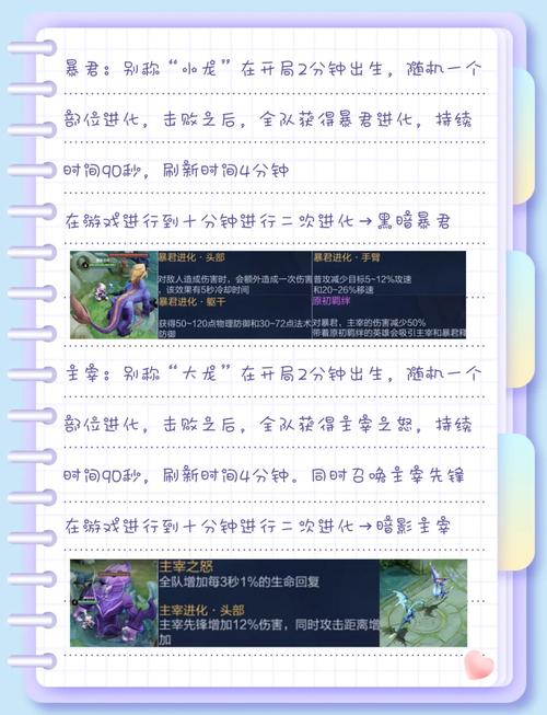 首次刷新时间:30秒。之后被击杀的刷新间隔:90秒。这两种BUFF怪为打野英雄提供了重要的增益效果,因此掌握它们的刷新时间对于控制地图和节奏至关重要。巨龙(普通暴君):首次刷新时间:2分钟。之后被击杀的刷新间隔:3分钟。