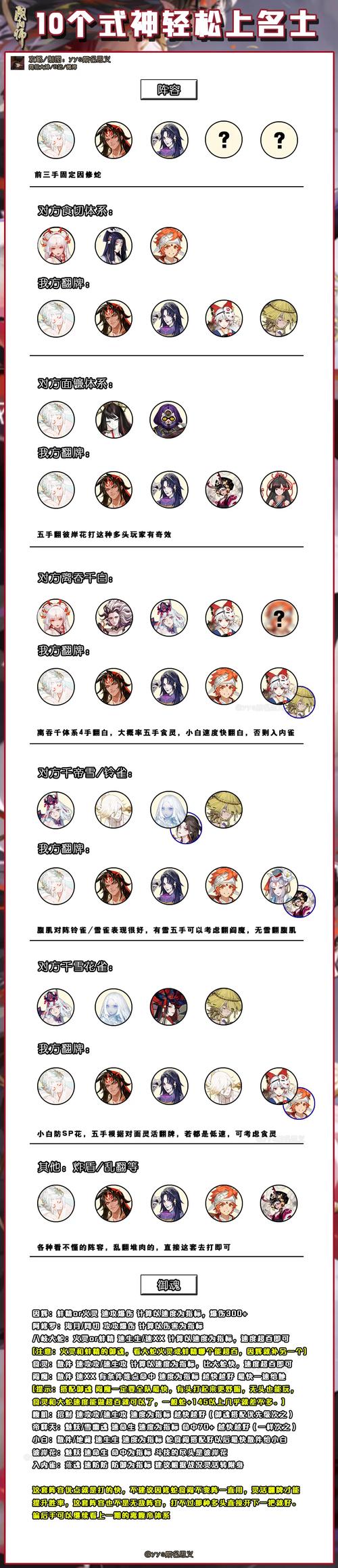 〖肆〗、T1式神:铃鹿御前:永动机队核心位置,2技能神技,常用御魂招财/蚌精,速攻暴搭配。镰鼬:功能性式神,一速,常用御魂招财/散件,一速搭配。云外镜:最强脱控机制【镜佑】,低费火拉条,常用御魂招财/火灵/蚌精,速防防/速防生搭配。