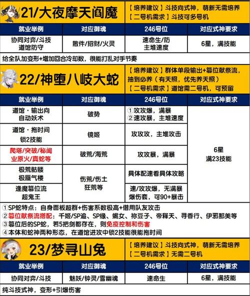 阴阳师2024年最全SP式神培养建议及御魂配置汇总:因幡辉夜姬 培养建议:绝对的T0增伤式神,适用于游戏前中后期几乎所有场景,是萌新必养的增伤式神。御魂配置:推荐选取招财猫或火灵四件套,以提高供火能力和生存能力。二号位速度/攻击加成,四号位攻击加成,六号位暴击/暴击伤害,根据队伍需求灵活调整。