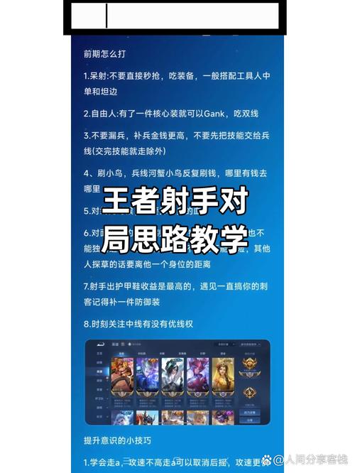 与队友沟通:保持良好沟通,共同制定战术,确保团队行动一致。适时支援:在团战中,根据战况适时支援队友,共同抵御敌方进攻。避免孤军奋战:尽量与队友保持协同作战,避免单独行动,降低被击杀风险。攻略技巧 选取合适英雄:根据对局情况选取适合当前版本的射手英雄,发挥个人优势。