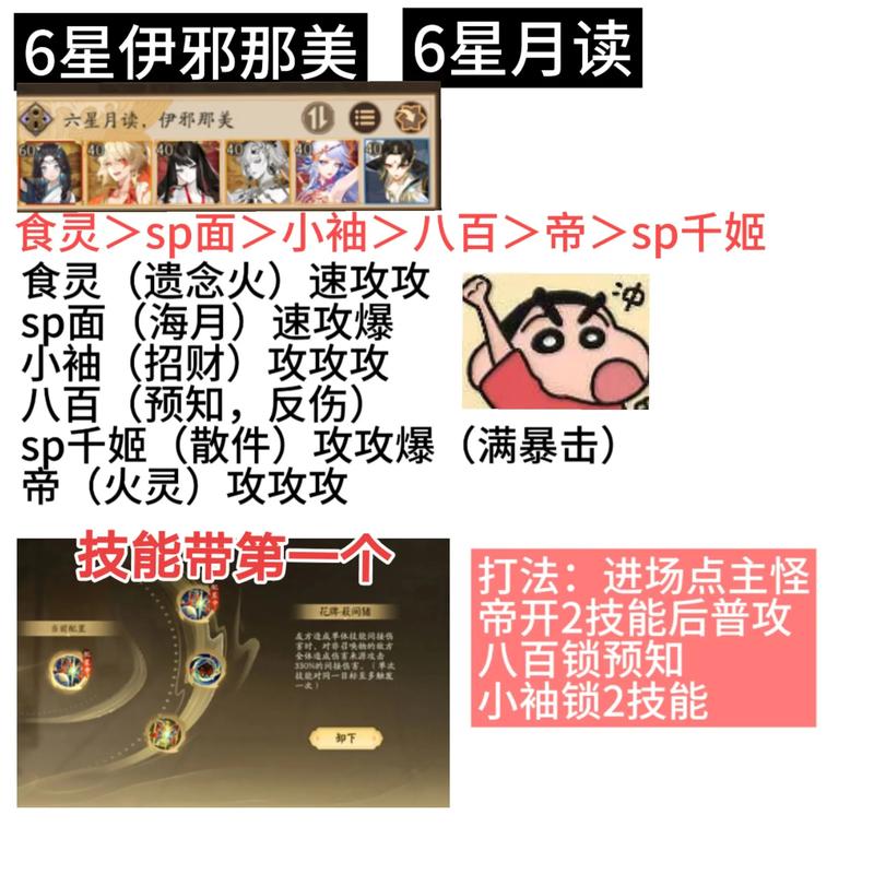 〖叁〗、阴阳师快速升6星的技巧主要包括以下几点:明确培养目标 专注培养核心式神:不要盲目培养多个输出式神,应重点培养一两个核心SSR式神,如酒吞、大天狗、茨木等。这样既能节省资源,又能确保伤害输出。精选辅助式神:同样,辅助式神也无需过多培养,根据常用阵容选取如山兔、椒图、打火机等辅助进行升星。