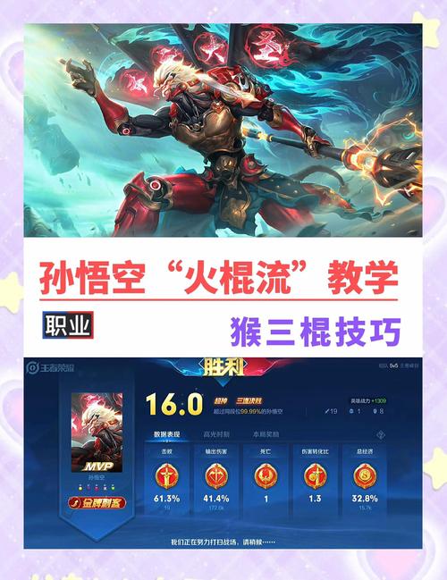 前期:猥琐发育,利用回复技能保持血量,避免正面参团。中期:游走支援,三棒全出暴击击杀射手,优势时不先手,侧面绕后,弱势时单带一路,拖延时间。后期:注意队友配合,切后排,利用草丛、闪现大招等操作强行击杀输出,看准时机。总结:孙悟空前期较弱,中后期变强,正确定位,避免前期死磕,后期畏缩。