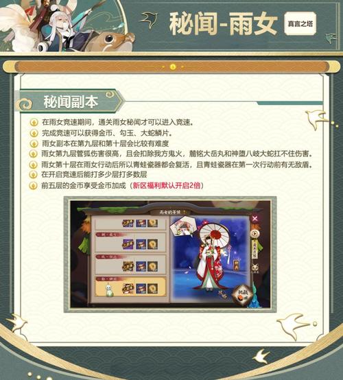 阴阳师中雨女比较多的刷新地点主要在以下几个副本:探索副本 第4章首领挑战:这里是刷雨女的主要地点之一,雨女作为首领出现,挑战成功后可以获得大量的雨女碎片。御魂副本 御魂6层一回合:虽然每层只有1个雨女,但御魂副本是日常任务之一,可以顺便刷取。