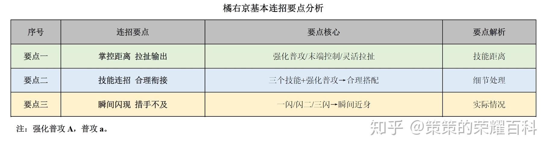〖贰〗、连招技巧 橘右京的连招以2技能起手为核心。首先,利用2技能远程晕住敌方英雄,紧接着普攻一下以触发被动技能,造成额外伤害。随后,使用1技能快速靠近敌方英雄,缩短距离并进行输出。最后,使用大招进行高额伤害并回复自身血量。
