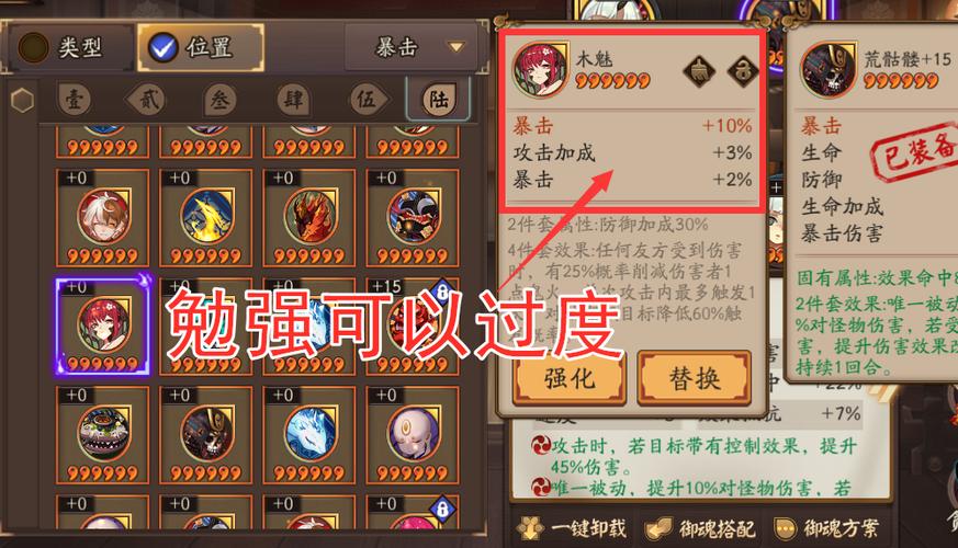 〖壹〗、三号位副属性为暴击、暴击伤害、生命加成的两件套+15%生命或暴击御魂:适用于治疗和盾系式神过渡期使用。五号位副属性为暴击、暴伤、攻击加成的两件套+15%攻击或暴击御魂:适用于输出式神过渡期。弃置剩余五星御魂:锁完以上御魂后,剩余五星御魂可以弃置,推荐奉纳以获得金币和金蛇皮等物资。