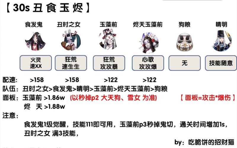 -16秒低配阵容 配置要求:1号阿修罗:狂骨+荒骷髅,攻攻暴,速度158以上,面板19780以上。2号阿修罗:心眼+荒骷髅,攻攻暴,速度155以上。饭笥:狂骨+歌伎,攻攻爆,速度无要求。食灵:火灵四件套,速度无要求,二技能4级。阴阳师:小晴明(动画速度最快)。