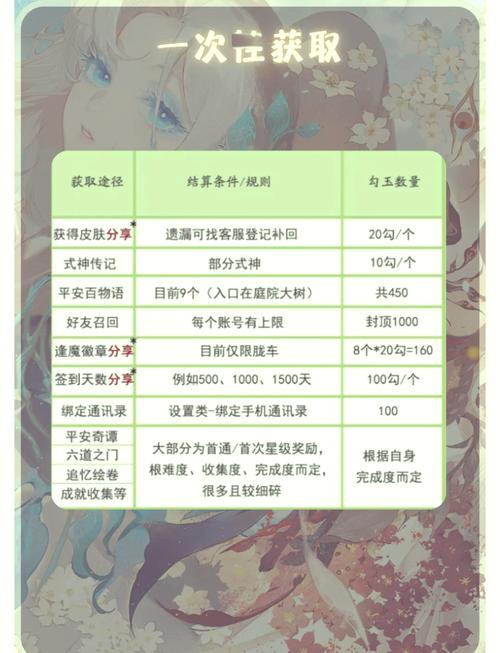 〖肆〗、每周的秘闻副本是游戏中常驻获得勾玉的活动,玩家可以通过参与这些副本积累勾玉。 每天完成日常任务和挑战地域鬼王,可以获取到固定的勾玉奖励,这些活动简单且容易参与。 游戏内还会不定期举行各种限时活动,参与这些活动有机会获得大量勾玉,玩家可以根据自己的时间安排参与。