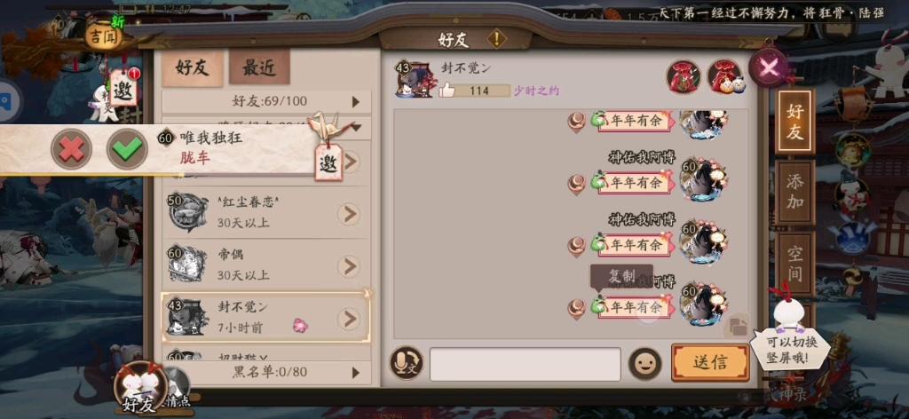 〖贰〗、在阴阳师游戏中,每个账号仅限领取一次新年礼包。具体操作方法如下:首先,在游戏主界面中找到阴阳寮图标,点击进入。随后,在阴阳寮界面中输入“年年有余”四个字,接着点击“发送”按钮。在点击发送后,将会弹出一个红包,点击领取即可获得188勾玉作为奖励。