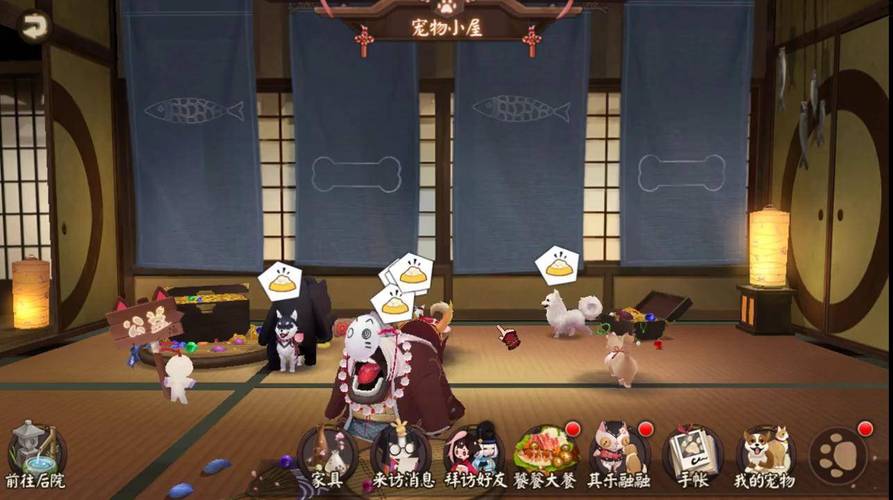 〖陆〗、猫派式神则会吸引流浪小猫。安置好式神,需要选取放置对应的食物。鲜鱼和排骨分别会吸引猫猫和狗狗。星级高的食物,一次可吸引多只小动物。食物主要通过悬赏封印的特殊任务获得,多人协作任务会得到高星食物。宠物小屋 小动物们平时都在宠物屋里玩耍,想查看自己的小动物并喂食,请前往小屋。