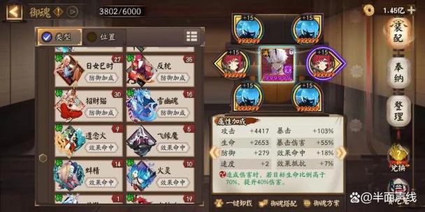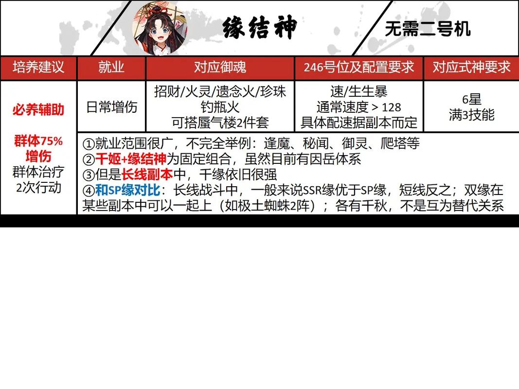 〖叁〗、御魂套装:招财:适合持续作战,推荐。火灵:适合快速高效通关或瞬间爆发。散件:纯工具人搭配法,一般不推荐。实际推荐:招财,火灵。速生暴击。缘结神御魂搭配推荐,配置不高,亲民的SSR式神。速抗生/速生暴:堆高抵抗,速抗生不错;如果人品好或有云外镜阵容,可以考虑速生暴。