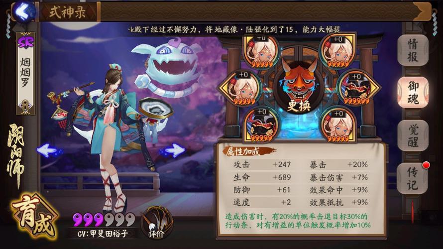 〖叁〗、二号位:二号位会出速度和攻击加成,速度是阴阳师输出式神的首选,抢先出手,才能够占尽先机。2,四号位:四号位会出攻击加成和效果抵抗。如果追求输出,可以选取攻击加成,但是打斗技的时候,烟烟罗怕控制,所以选取效果抵抗也是不错的选取。
