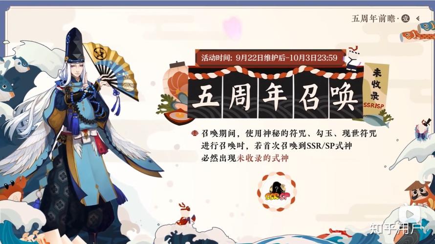 〖肆〗、阴阳师五周年庆活动将持续半个月左右,活动从9月23日开始。活动期间,首次召唤SSR/SP式神必出未收录式神,并且每个玩家可以享受三次概率UP的机会。活动时间持续到10月3日。平安美食祭在9月22日至10月7日期间举行,玩家可以与新式神食灵和饭笥一同经营美食街,活动结束后可以获得一套町中皮肤。