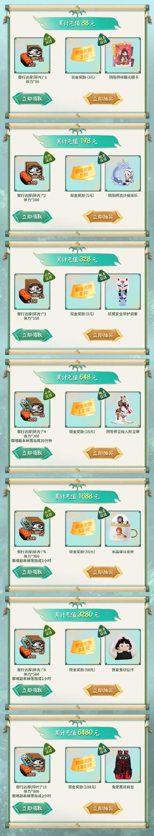 ※周年庆礼包壹:售价魂玉*128,内含勾玉*750,奉为达摩*2,大吉达摩*2,金币*50000。※周年庆礼包贰:售价魂玉*328,内含神秘的符咒*22,4星奉为达摩*2,大吉达摩*2,5星青吉鬼*2,金币*100000。