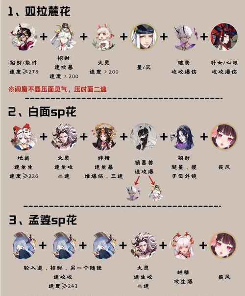 SP彼岸花阵容 【1】斗技:彼岸花一般带魅妖或钟灵限制对面一速,但斗技场云外镜多,建议优先配钟灵花。还有输出花,御魂要求爆伤心眼或网切狂骨,配合双化鲸双驴妈两回合炸对方全队,或结界防守日白花,四保一。