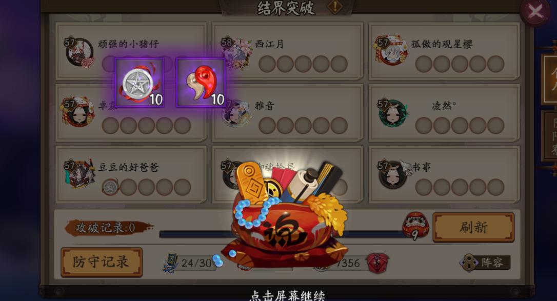 〖肆〗、结界突破:结界突破分个人结界突破和阴阳寮结界突破,个人结界突破有突破券就刷。但是其实较主要的获得方法是打阴阳寮的结界,注意好自己公会是几点开的。到点了,就可以疯狂刷。每个阴阳寮10分钟打一次个人和组队,建议一定要打满。等待cd过后再去打。