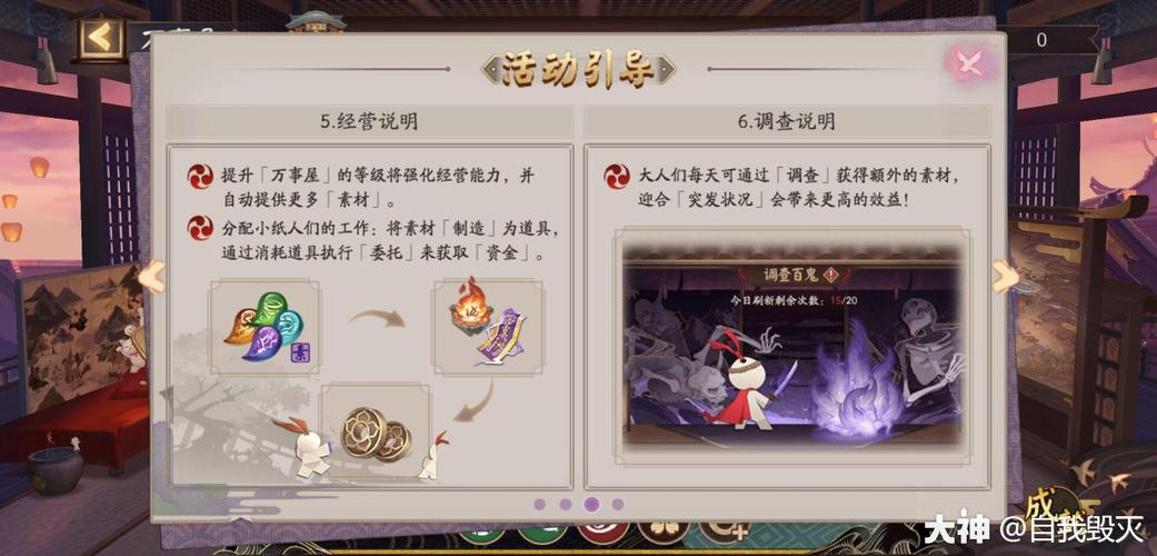 观察小纸人的工作能力分为两种。制造道具道具很好生产,基本上没有难度,近来制造道具所需要的消耗品大部分都是跟随着时间自然增加,同时通过【调查百鬼】也有不少数量的获取。所以只要玩家注意库存就ok啦。接受委托我们需要的万事屋经验和经营总资金都是需要靠接受委托这个部分来获得。