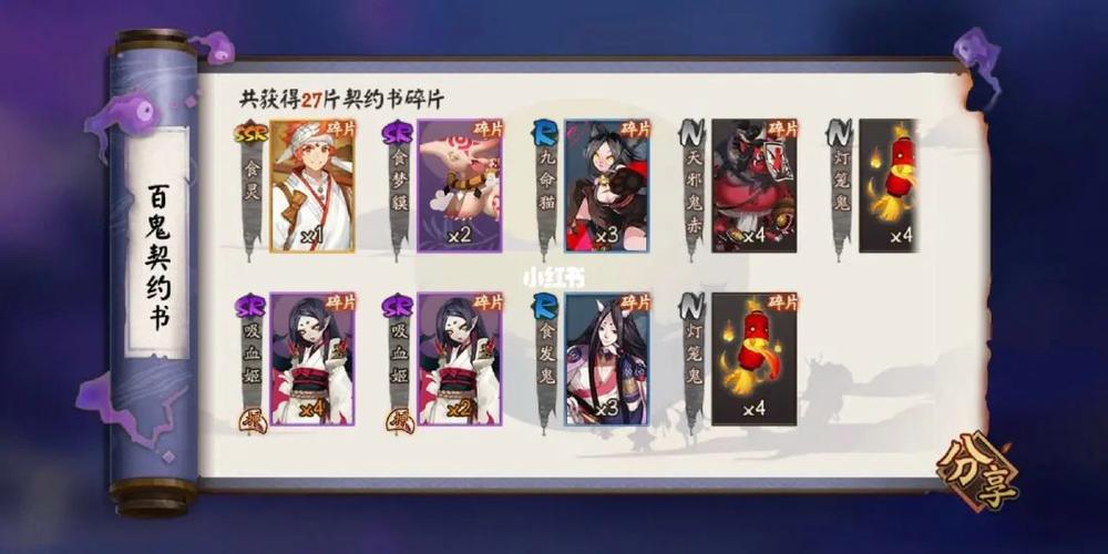 〖伍〗、在手游《阴阳师》中,要集齐一定数量的碎片才可以召唤式神,契约书在式神录里的式神碎片界面查看。碎片的获取方式有三种:通过打百鬼夜行获得。阴阳寮寮友之间可以赠送碎片。每天五点打逢魔之时就能获得碎片。