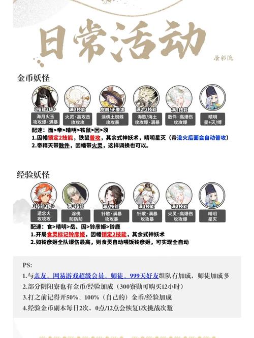 〖肆〗、打副本奶不是特别重要,尤其是在前期,最佳阵容应该是两个输出加一个座敷童子。(不考虑狗粮的话)每天的任务不要少做,中午十二点和晚上八点都有体力,竞技打点荣誉值,每天19点阴阳寮打boss,13点和20点町里打妖怪治退,13:30和20:30妖怪治退里领宝箱,一个都不要落下。