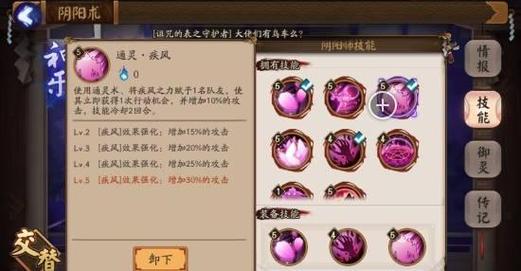 〖肆〗、阴阳师手游神乐技能搭配攻略:通灵·疾风:必带技能!可以让一名友军立即获得一次行动机会,并增加10%的攻击。无论是给主力输出式神多一次输出机会,还是在鬼火不足时给队伍末尾的式神普攻,都非常实用。通灵·冥蝶:PVP推荐技能。