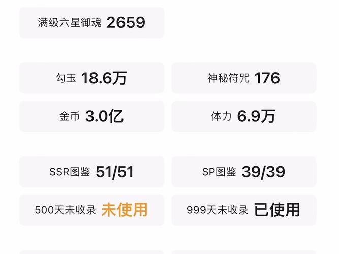 全图鉴,尤其是SSR图鉴,伪全图鉴也可以接受。逢魔章和天下章,综合练度高的号头像框如月见黑、日之曜、日月同辉。头像框:月见黑400连抽无SSR获得,日之曜ssr全集赏获得,日月同辉500连抽无SSR+日之曜。皮肤:阴阳师、式神、庭院皮肤,特别是活动限定皮肤。